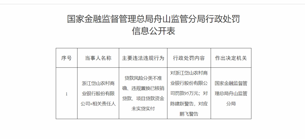7月29日,国家金融监督管理总局舟山监管分局行政处罚信息公开表显示,浙江岱山农村商业银行股份有限公司+相关责任人,贷款风险分类不准确、违规置换已核销贷款、项目贷款资金未实贷实付,对浙江岱山农村商业银行股份有限公司罚款95万元;对陈建跃警告,对应鹏飞警告。