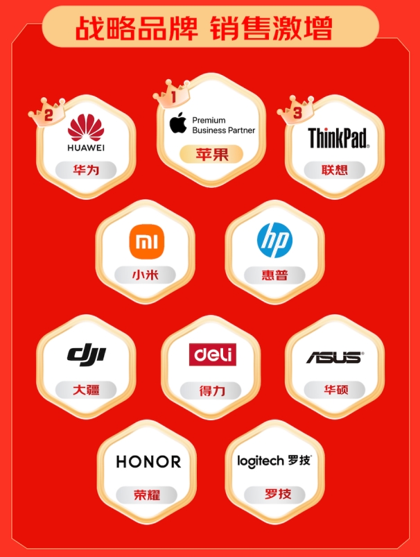 在品牌侧,华为、苹果、联想、小米、惠普、大疆、得力、华硕、荣耀、罗技等战略合作伙伴均成交表现优异,共同构建出覆盖多场景、全链路的品牌供应体系,推动企业采购生态持续优化。