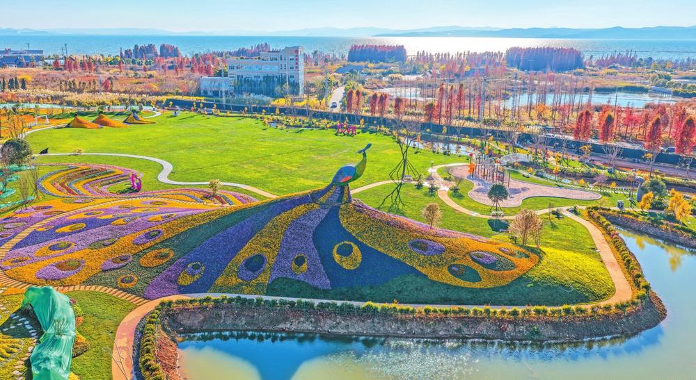 位于滇池东岸的巨型孔雀花坛。云南日报记者 陈飞 摄