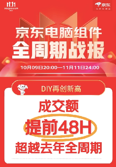 依托超级供应链资源整合优势,本届京东11.11整体成交额再创新高,下单用户数增长40%,订单量增长近60%,为消费者带来更多又好又便宜的商品和服务。其中,作为备受年轻人青睐、重性能更重颜值的DIY电脑组件品类,也取得亮眼销售战绩。截止11月11日24:00,DIY电脑组件成交额提前48小时超越去年全周期,高性能CPU、OLED显示器、RGB灯条等多品类销售数据呈现爆发式增长,彰显京东在3C数码领域的领先优势。